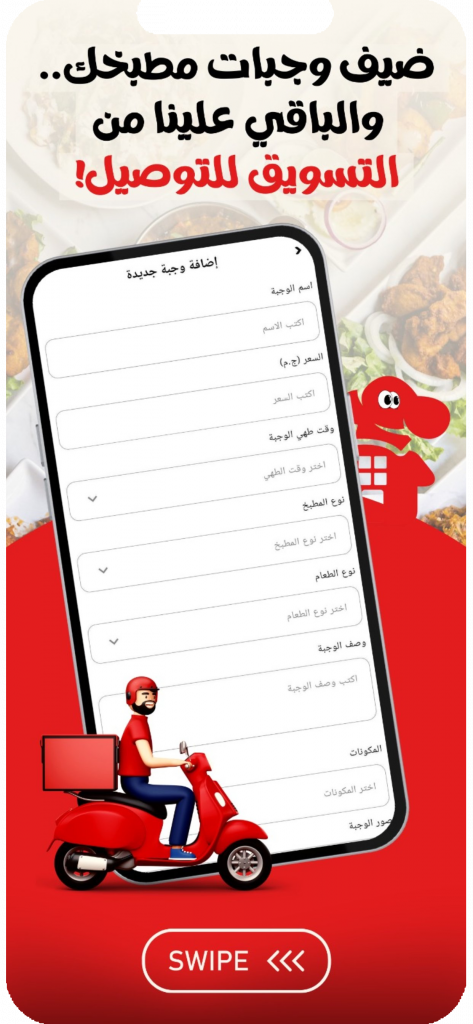 - ضيف وجباتك وأطباقك المميزة بتفاصيلها على التطبيق: (صور – أسعار – نوع – مكونات …)، واكتب كل ما يجب أن يعرفه زبائنك في وصف الوجبة.