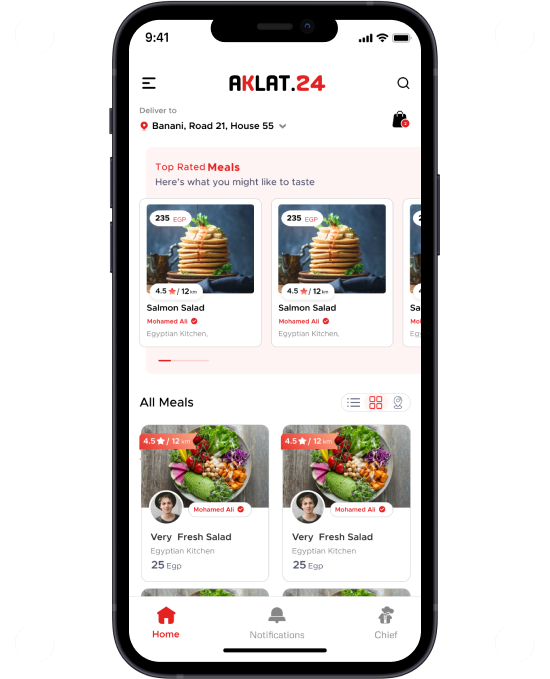 أكلات.24 هو أول تطبيق لمشاركة الأكل البيتي، هيساعدك تلاقي أقرب الطباخين المحترفين في منطقتك وتطلب منهم بسهولة الوجبات البيتي الصحية والفريش اللي بتحبها.